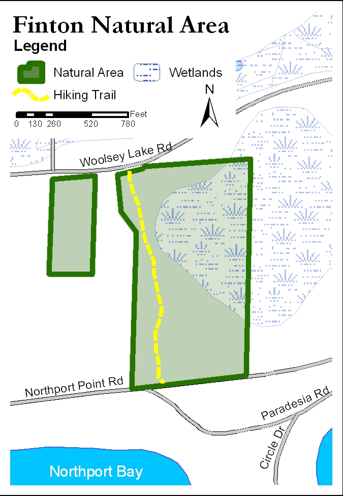 This 35-acre natural area has majestic hardwoods and a small area of cedar swamp. Finton a good place for viewing wildflowers and birding.
