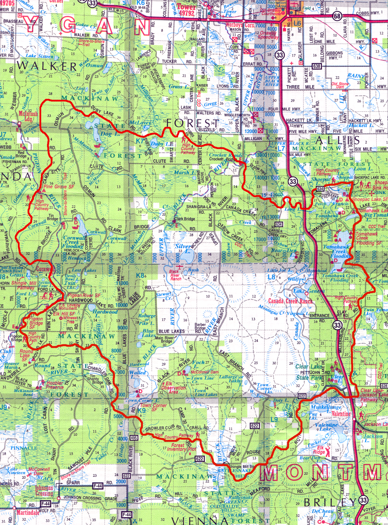 The High Country Pathway is a 70+ mile trail system that runs through the heart of Pigeon River Country in Montmorency and Otsego Counties. It is designed to provide the more enthusiastic backpacker and mountain biker with about one week of high quality outdoor adventure. The pathway connects to and is accessible by Jackson Lake State Forest Campground, Pigeon River Bridge State Forest Campground, Pine Grove State Forest Campground, Round Lake State Forest Campground, Shoepac Lake State Forest Campground, Tomahawk Creek Flooding State Forest Campground, and Town Corner Lake State Forest Campground.