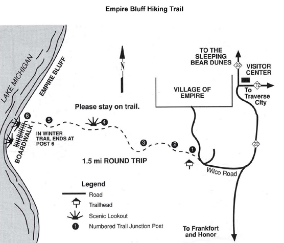 Trail brochures are available at the trailhead that provide interpretive descriptions of areas along the trail. To access the trail, follow M-22 to Wilco Road and follow it to the top of the hill. Trailhead parking and a picnic area are on the left.