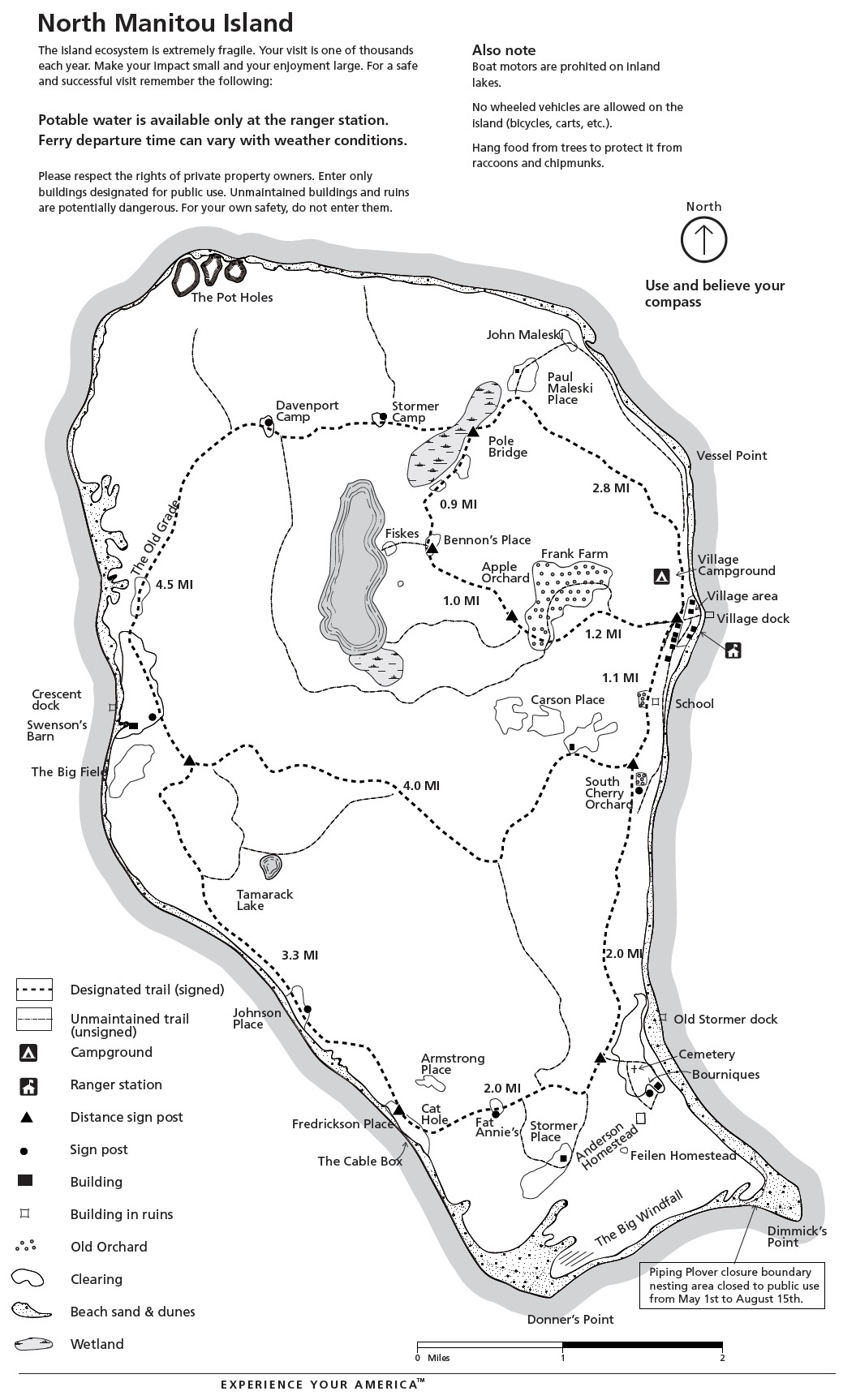 North Manitou has 15,000 acres of wilderness and 20 miles of shoreline for visitors to explore. Self-reliance is essential as there are no services or supplies available on island. Travel in the wilderness area is by foot only. With many miles of trails in a highly remote location, North Manitou is a hiking and backcountry camping destination.