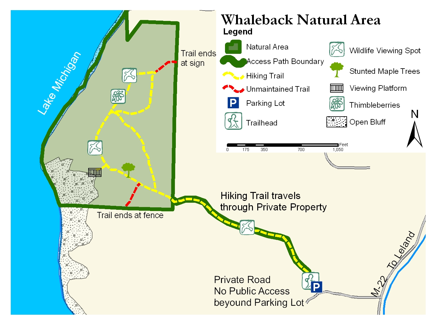 The natural area is located within easy walking distance of the village of Leland. When you visit, please realize that the land on both sides of the access trail is private and is not open to the public.